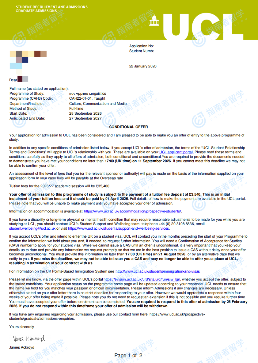 伦敦大学学院应用语言学文学硕士研究生offer一枚