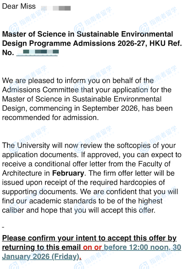 香港大学可持续环境设计理学硕士研究生offer一枚