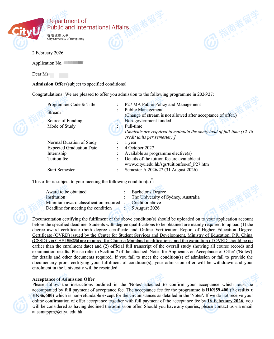 香港城市大学公共政策与管理文学硕士研究生offer一枚