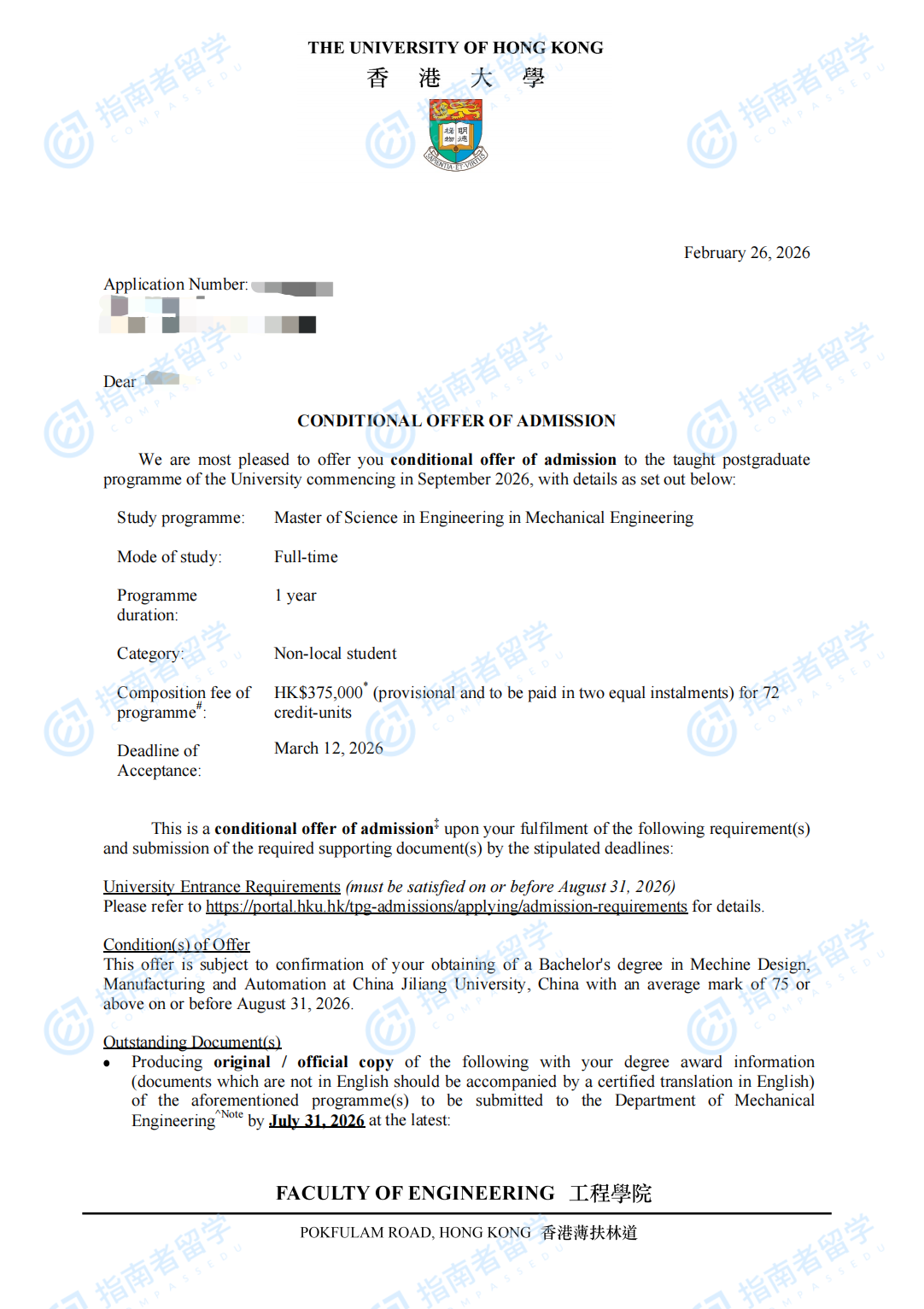 香港大学机械工程(工程)理学硕士研究生offer一枚