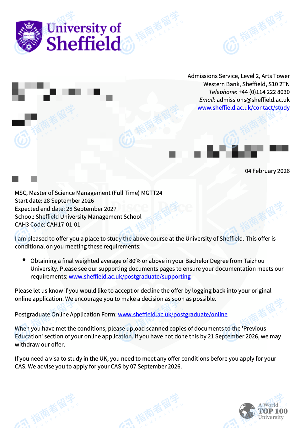 谢菲尔德大学管理学理学硕士研究生offer一枚