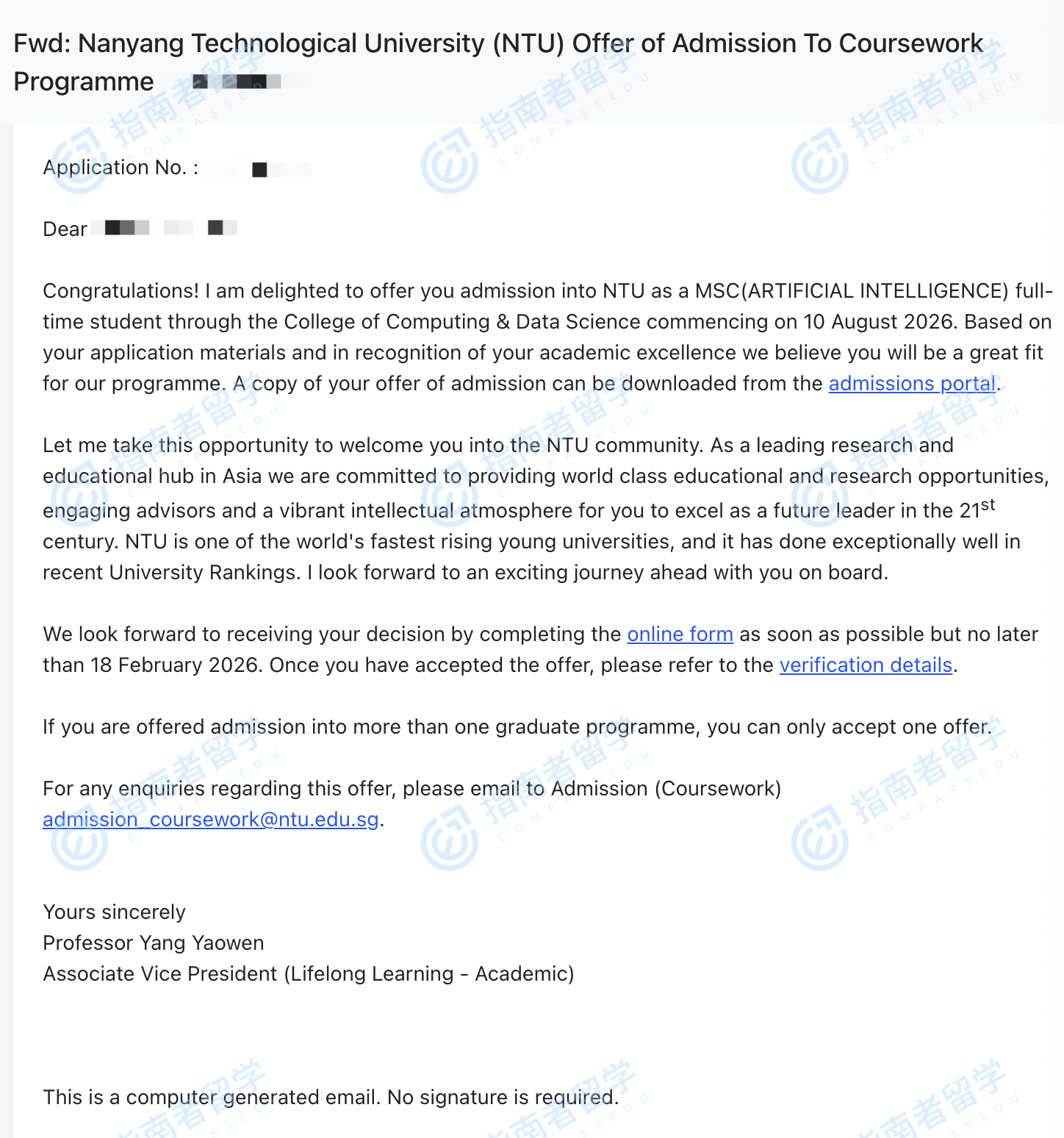 南洋理工大学人工智能理学硕士研究生offer一枚