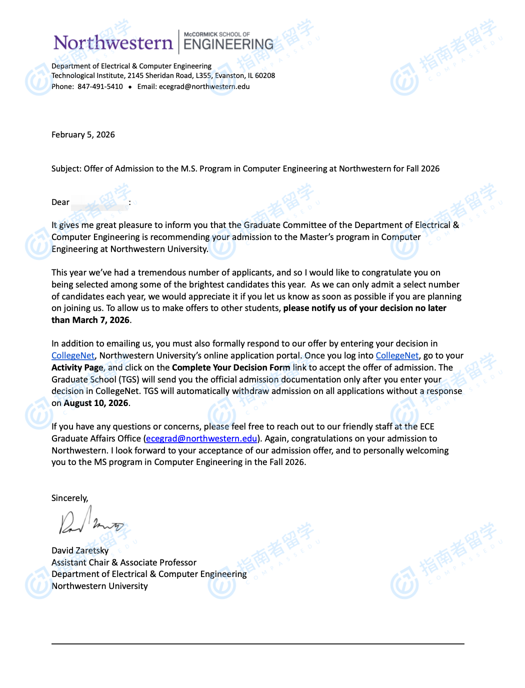 西北大学(美国)计算机工程硕士研究生offer一枚