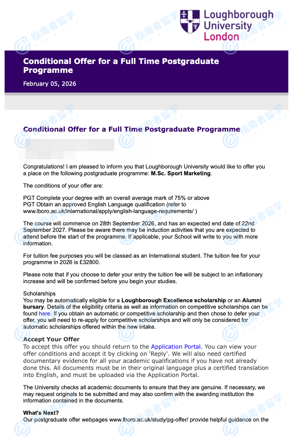 拉夫堡大学体育营销理学硕士研究生offer一枚