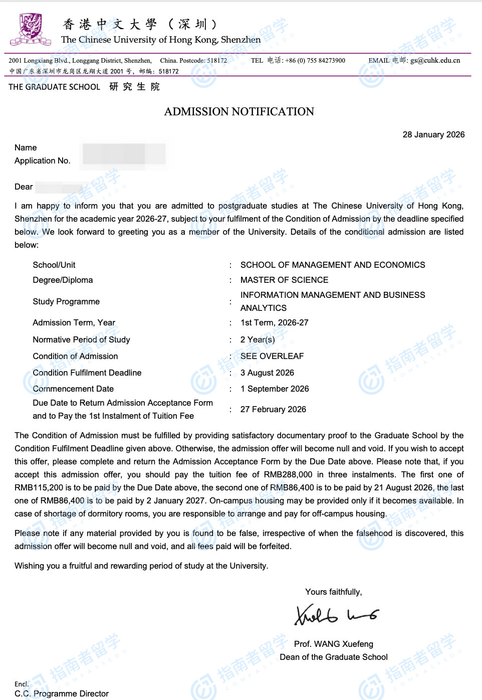 香港中文大学信息管理 & 商业分析理学硕士(CUHK-Shenzhen)研究生offer一枚
