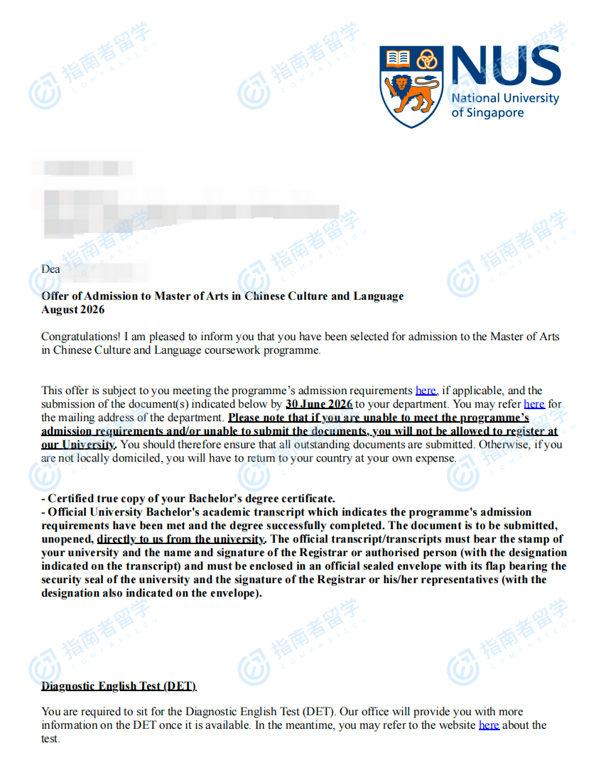 新加坡国立大学中国文化与语言文学硕士研究生offer一枚