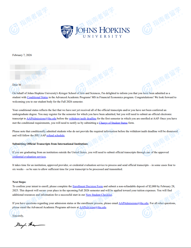 约翰霍普金斯大学金融经济硕士研究生offer一枚