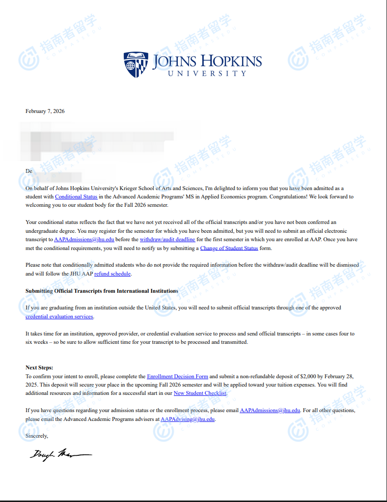 约翰霍普金斯大学应用经济硕士研究生offer一枚