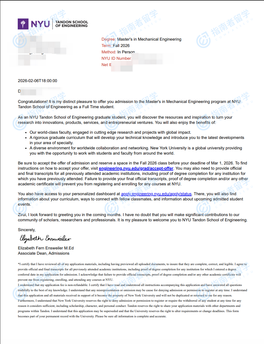 纽约大学机械工程理学硕士研究生offer一枚