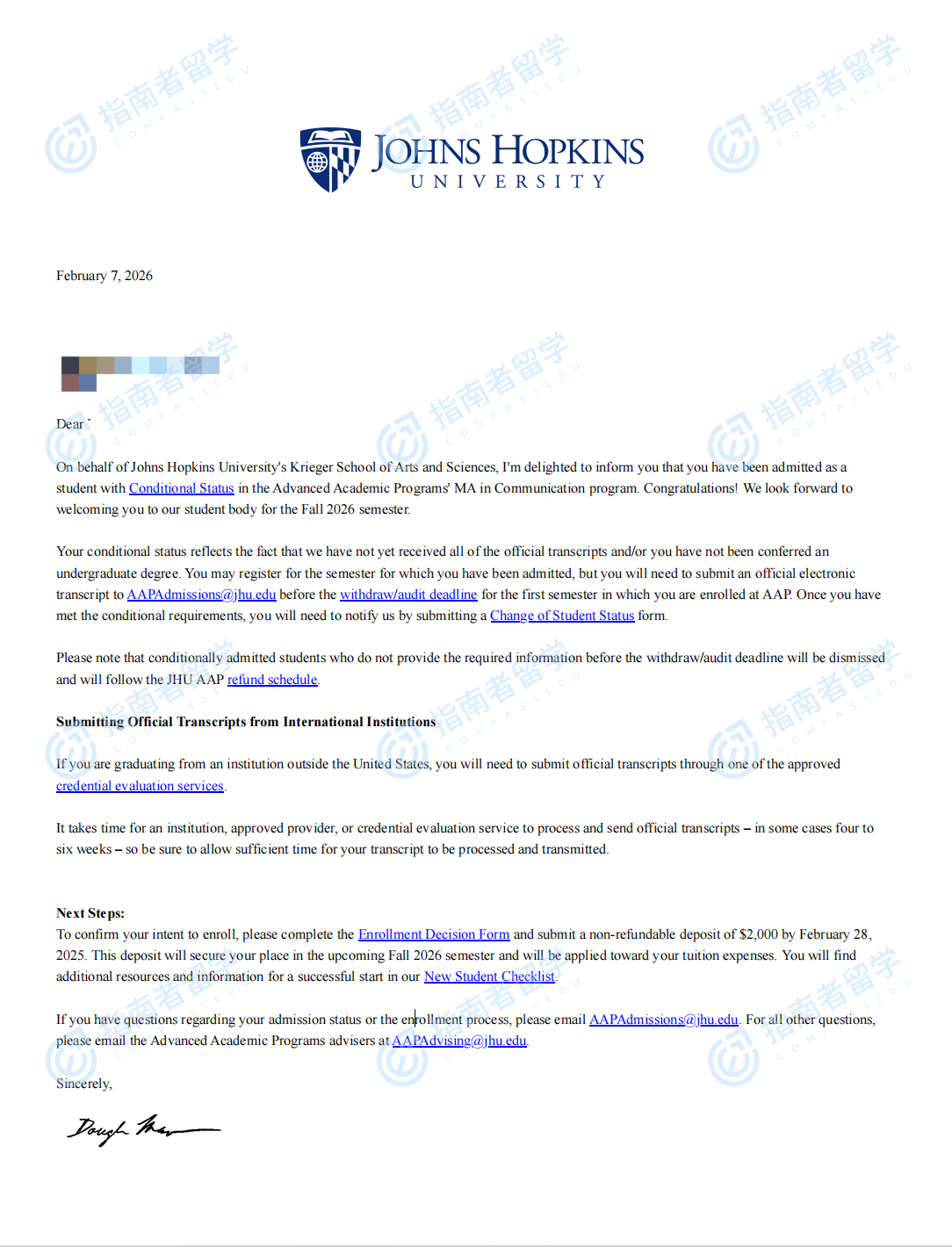 约翰霍普金斯大学传播学硕士研究生offer一枚