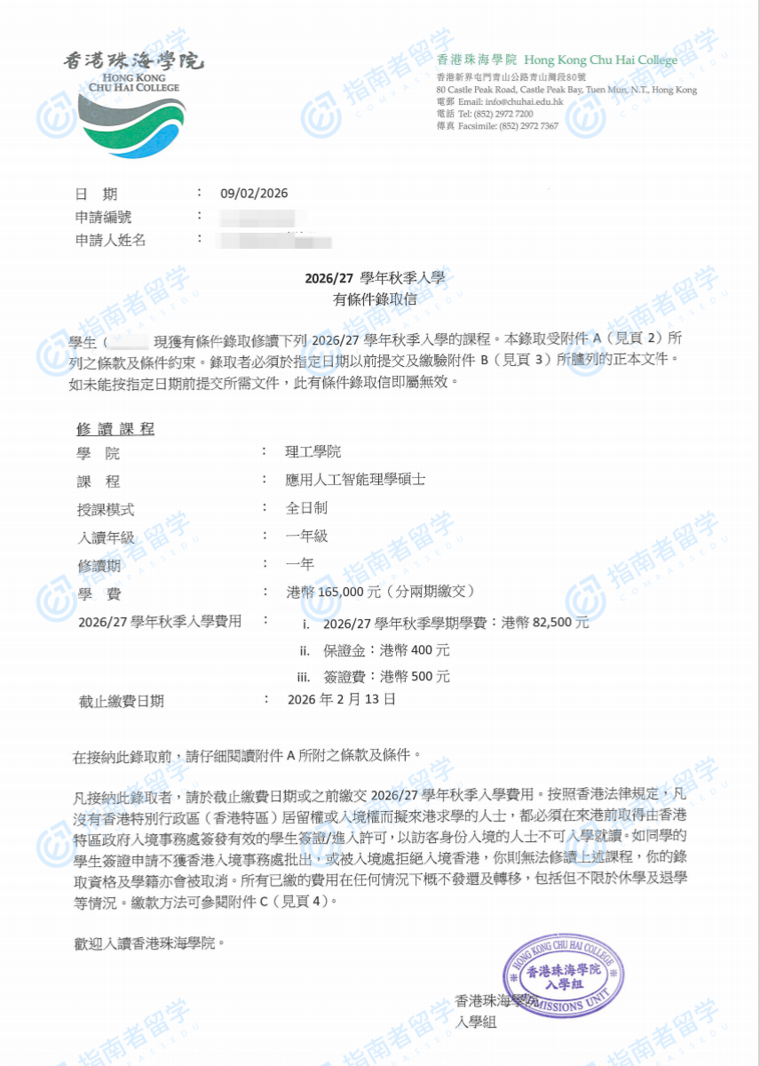 香港珠海学院应用人工智能理学硕士研究生offer一枚