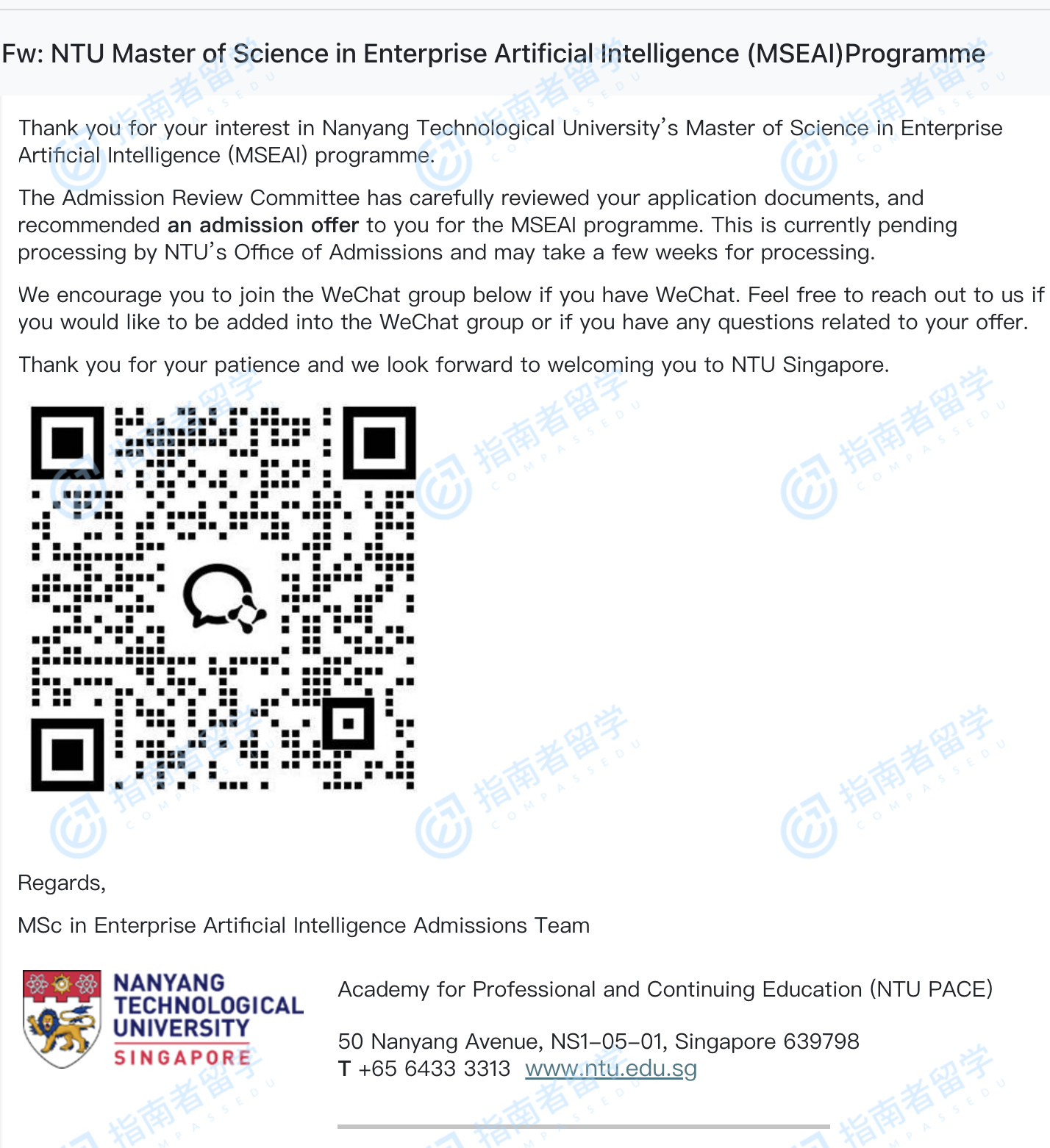南洋理工大学企业人工智能理学硕士研究生offer一枚