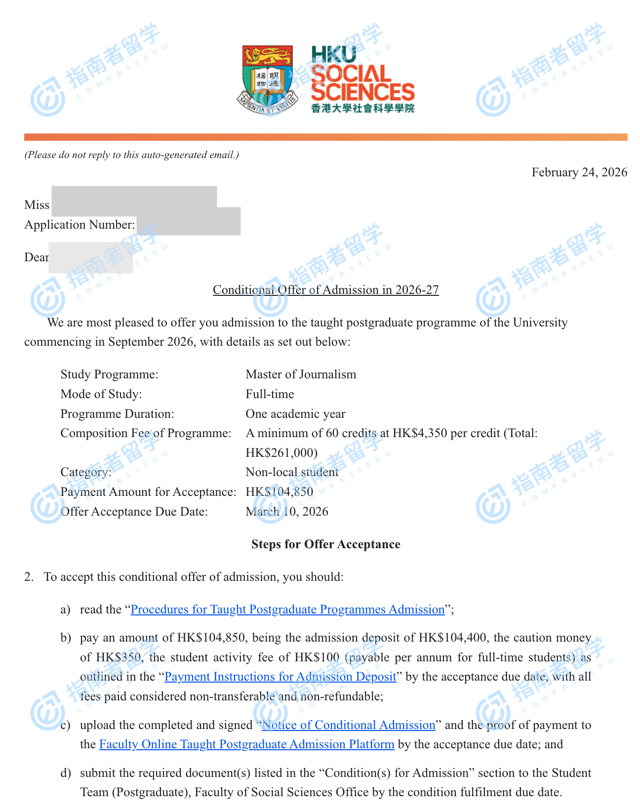香港大学新闻学硕士课程特色在于:以国际化、重实践、数字媒体为特色,提供全英的综合性融合媒体课程;旨在培养学生在数字媒体的变革下,掌握跨平台处理信息的能力,具备批判性思维,并能将新闻素养应用到各行各业;学生不仅要接受新闻报道与写作等核心技能训练,而且要求掌握融合媒体技术,比如制作广播电视新闻、网络新闻、纪录片、摄影等。为了增强学生的竞争力,香港大学新闻学硕士课程还设置了跨学科课程和研究项目,例如新闻法、财经新闻、中国报道、公共卫生/科技/环境报道等。另有非常广泛的科目可供学生选修,如商科、金融、法律等。新闻学硕士课程吸引了来自全球各地的学生报读,由富有业界经验和国际背景的老师亲身教授。 学生拥有全球各地媒体实习的机会。我们的毕业生不仅能够获得香港、中国大陆、美国等全球一流媒体机构的聘用,而且在公关、法律、商业等其他行业也表现卓越。