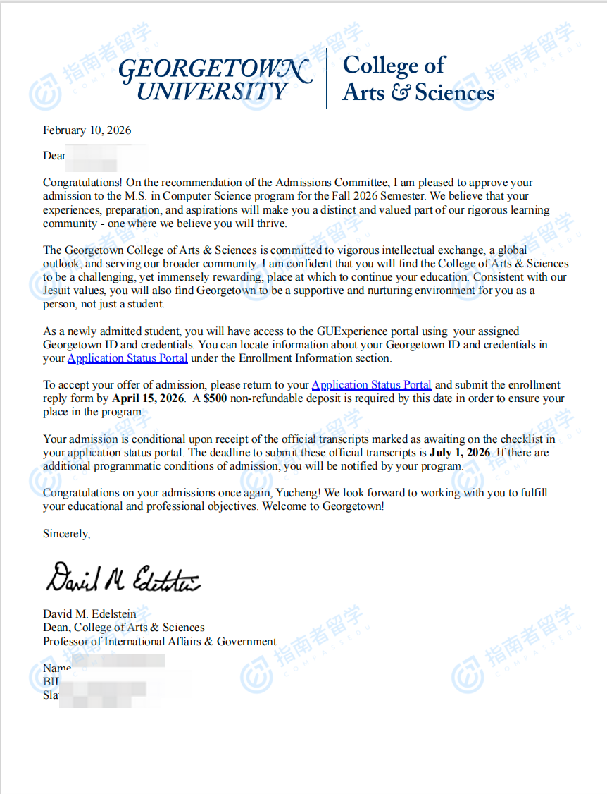 乔治城大学计算机科学理学硕士研究生offer一枚