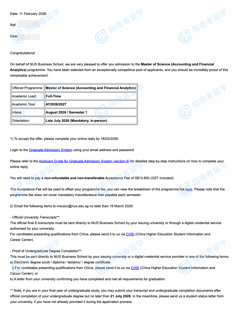 新加坡国立大学会计学理学硕士研究生offer一枚