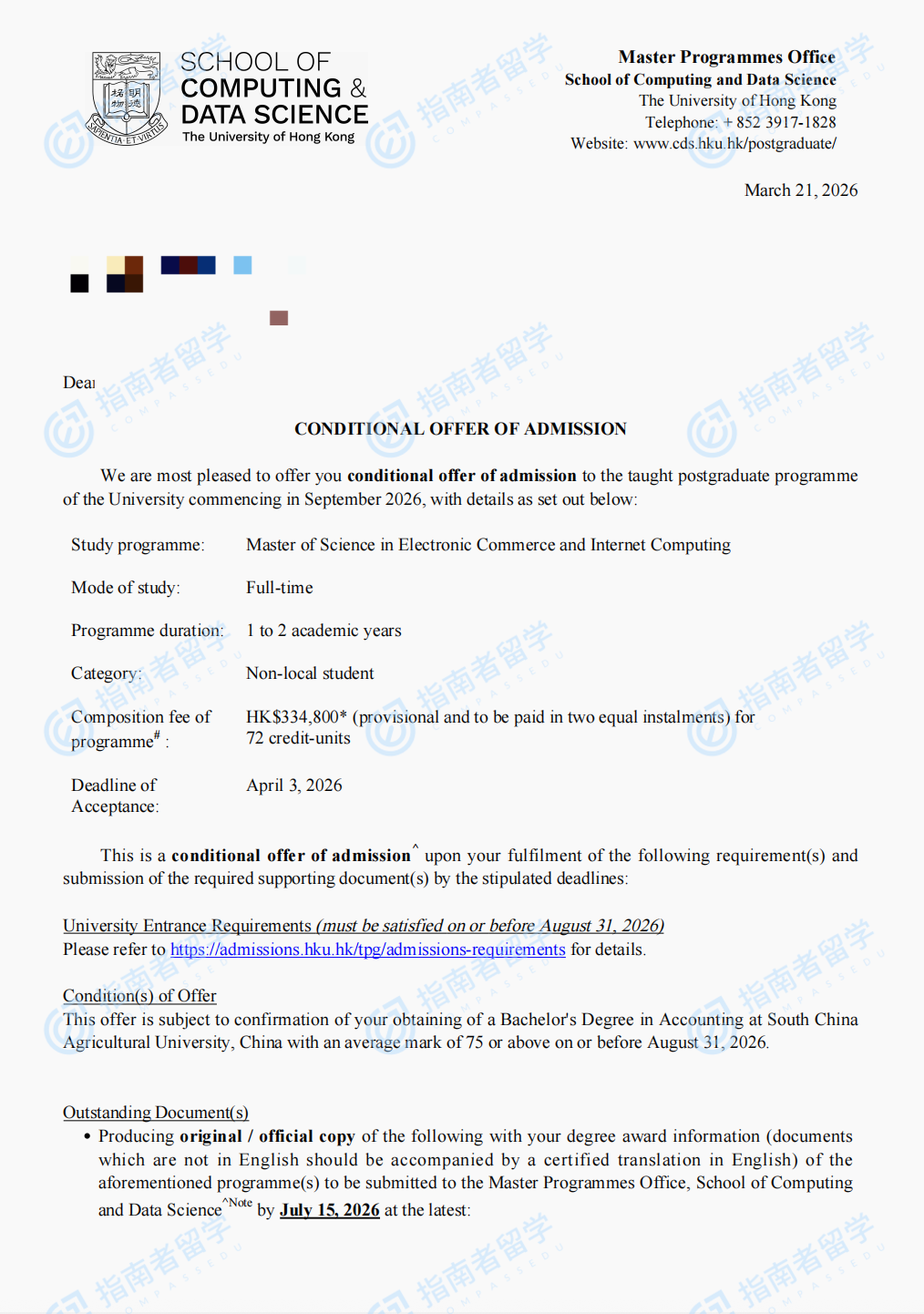 香港大学电子商贸及互联网工程理学硕士研究生offer一枚