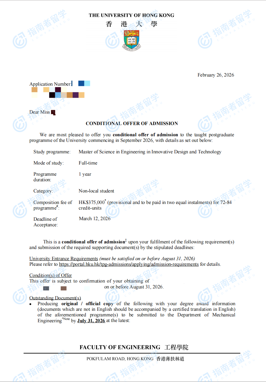 香港大学创新设计与科技(工程)理学硕士研究生offer一枚