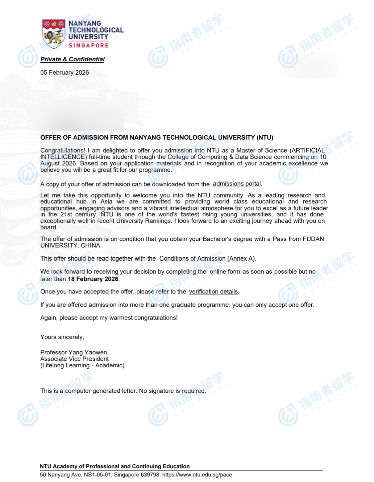 南洋理工大学人工智能理学硕士研究生offer一枚