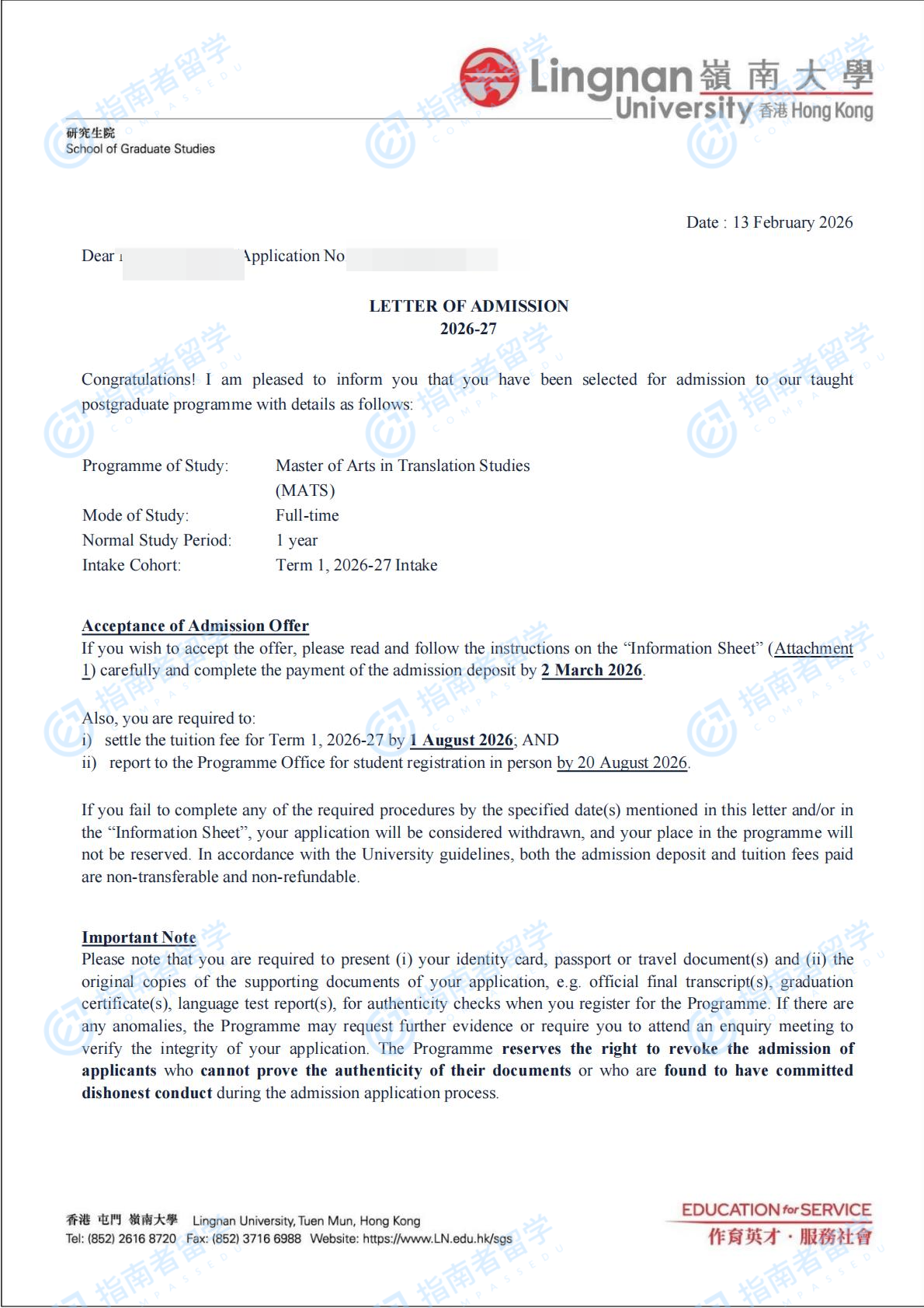 香港岭南大学翻译研究文学硕士研究生offer一枚