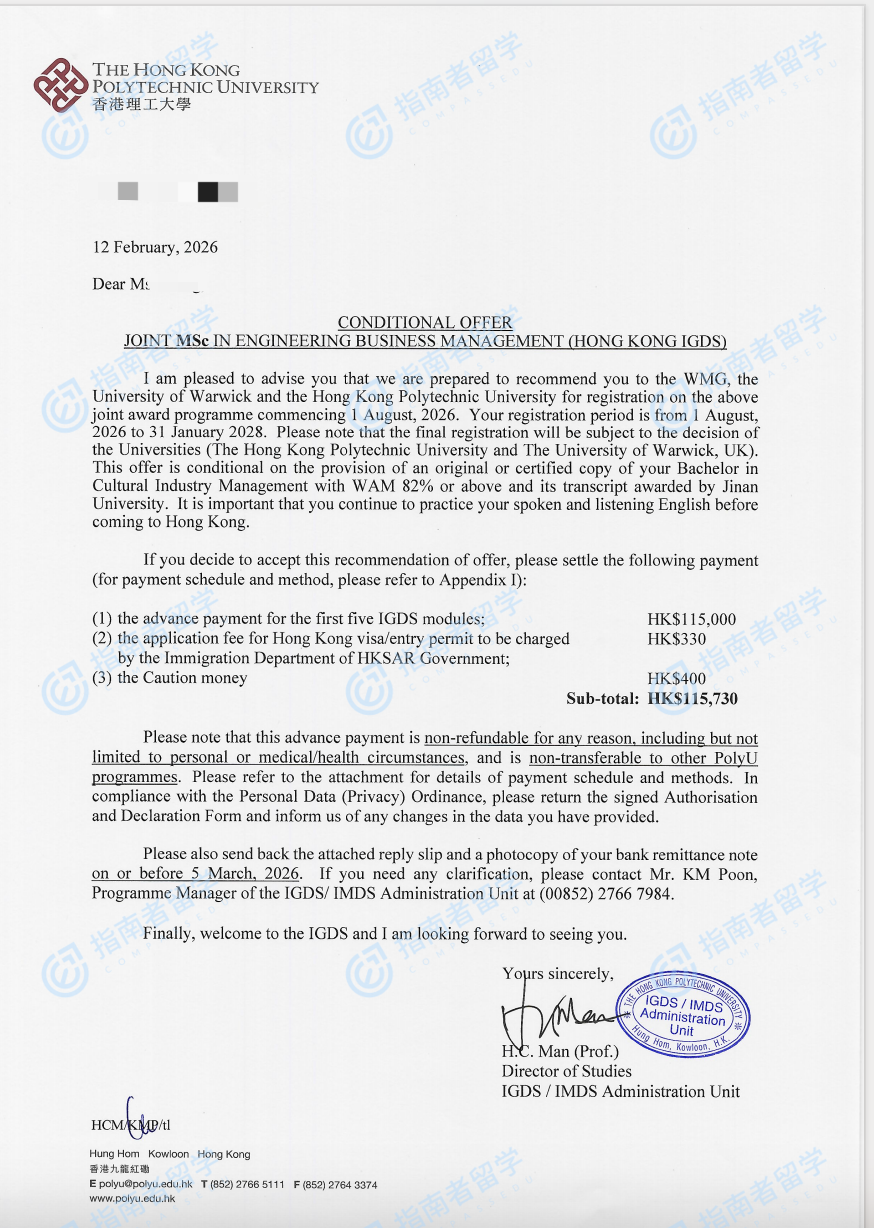 香港理工大学工程商业管理理学硕士研究生offer一枚