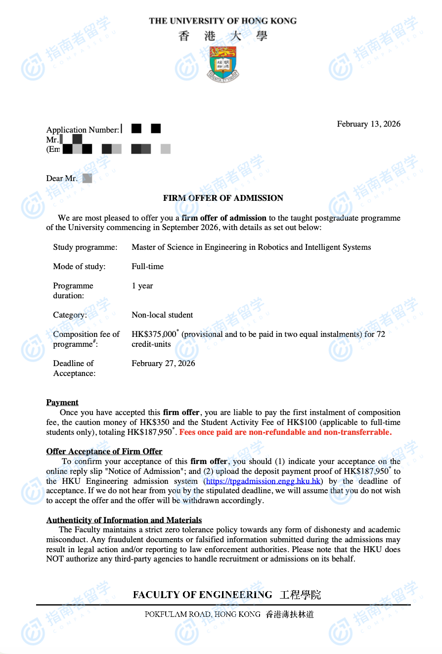 香港大学机器人与智能系统(工程)理学硕士研究生offer一枚