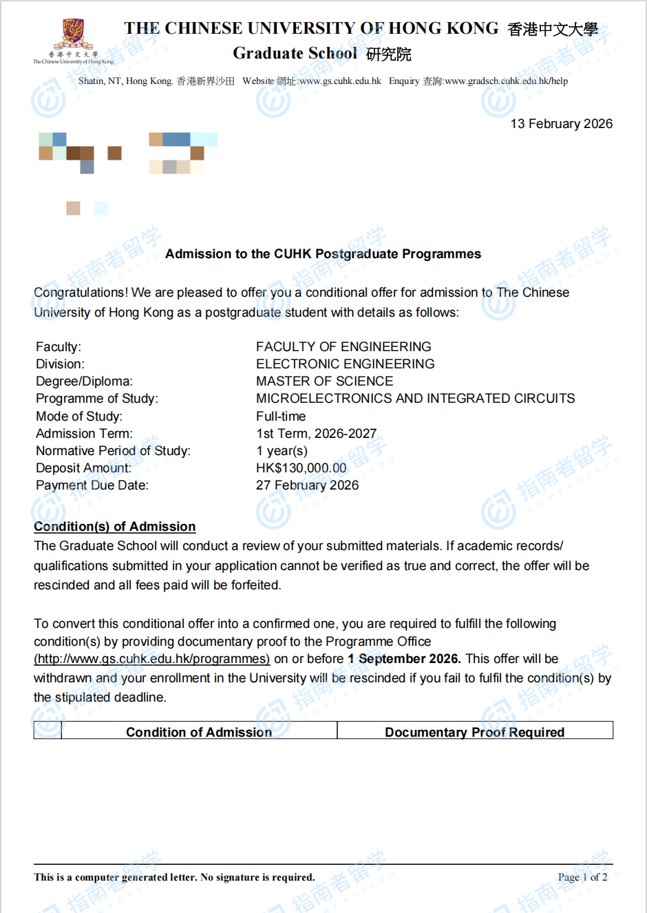 香港中文大学微电子与集成电路理学硕士研究生offer一枚