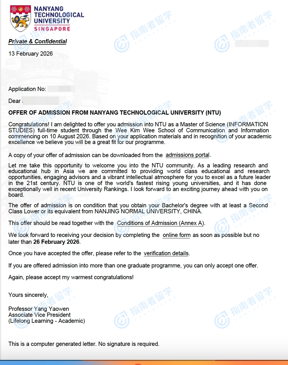 南洋理工大学信息研究理学硕士研究生offer一枚