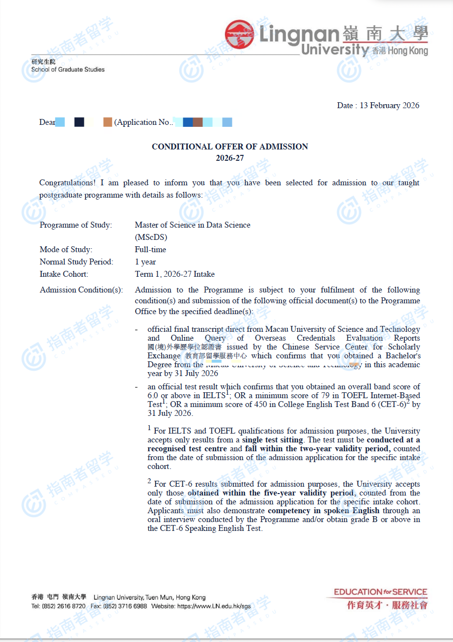香港岭南大学数据科学理学硕士研究生offer一枚
