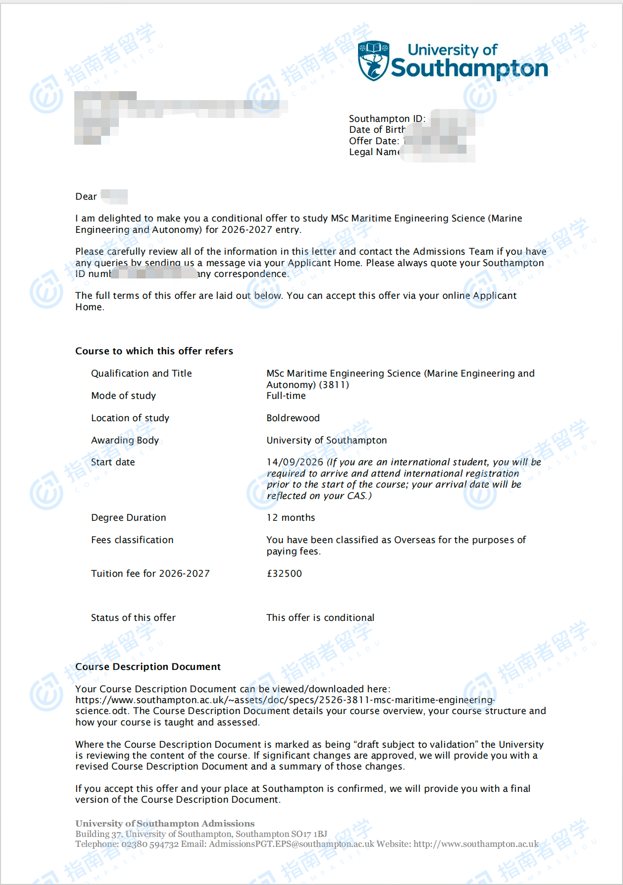 南安普顿大学海事工程科学(海洋工程与自治)理学硕士研究生offer一枚