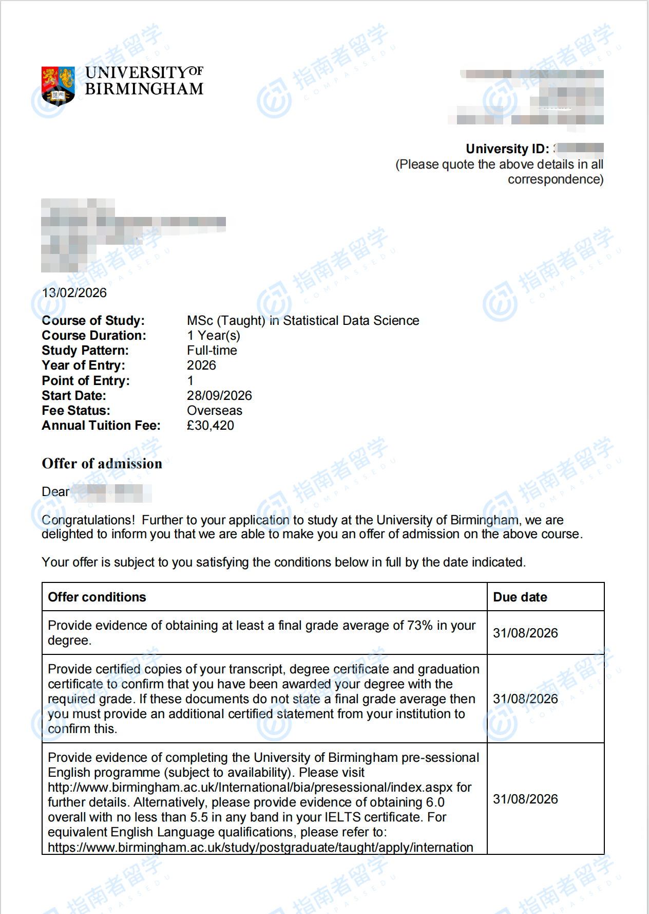 伯明翰大学统计数据科学理学硕士研究生offer一枚