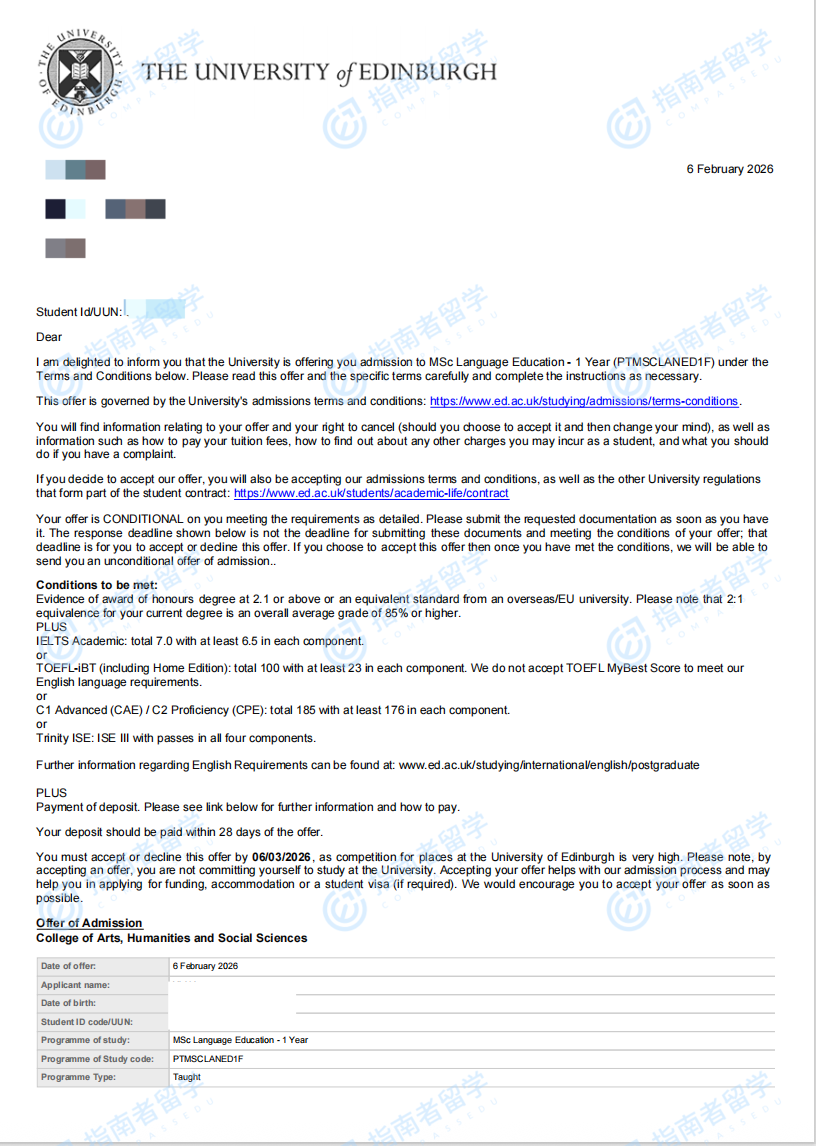 爱丁堡大学语言教育理学硕士研究生offer一枚