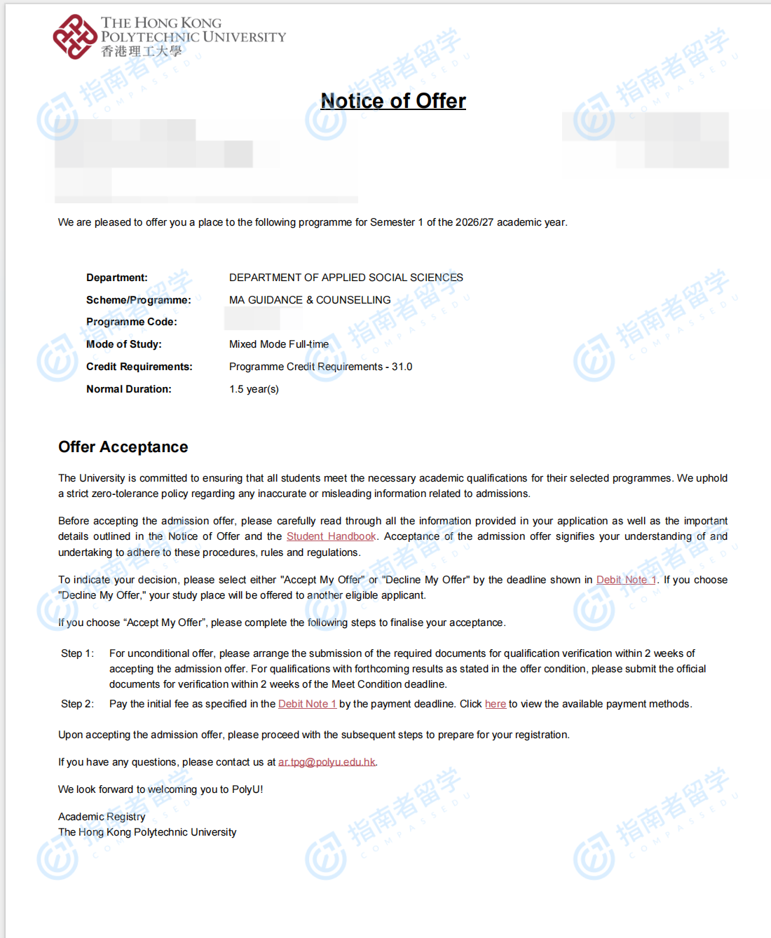 香港理工大学咨商与辅导文学硕士研究生offer一枚