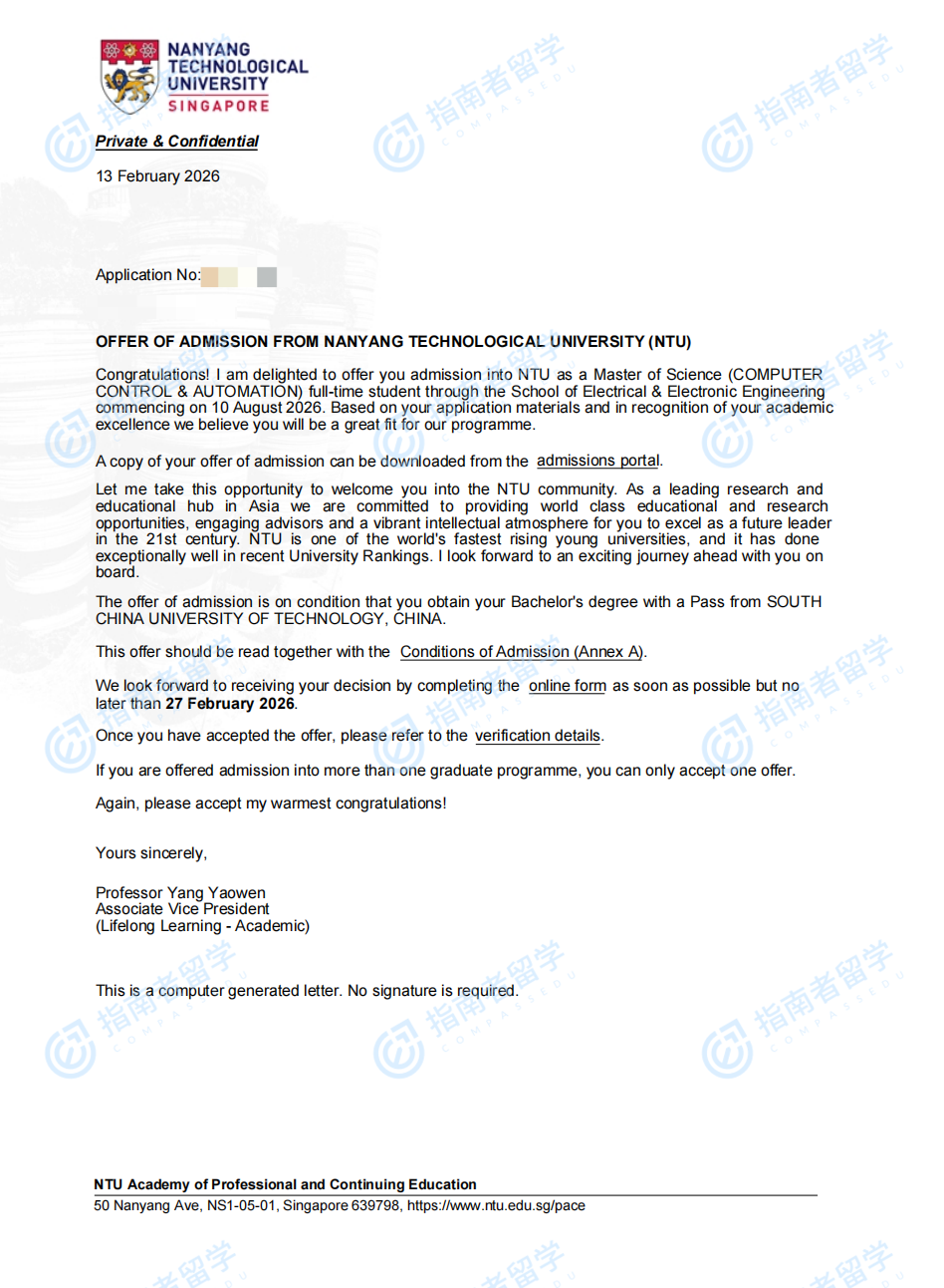 南洋理工大学计算机控制与自动化理学硕士研究生offer一枚
