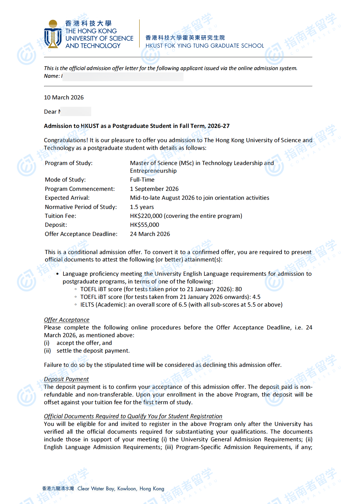 香港科技大学科技领导与创业理学硕士研究生offer一枚