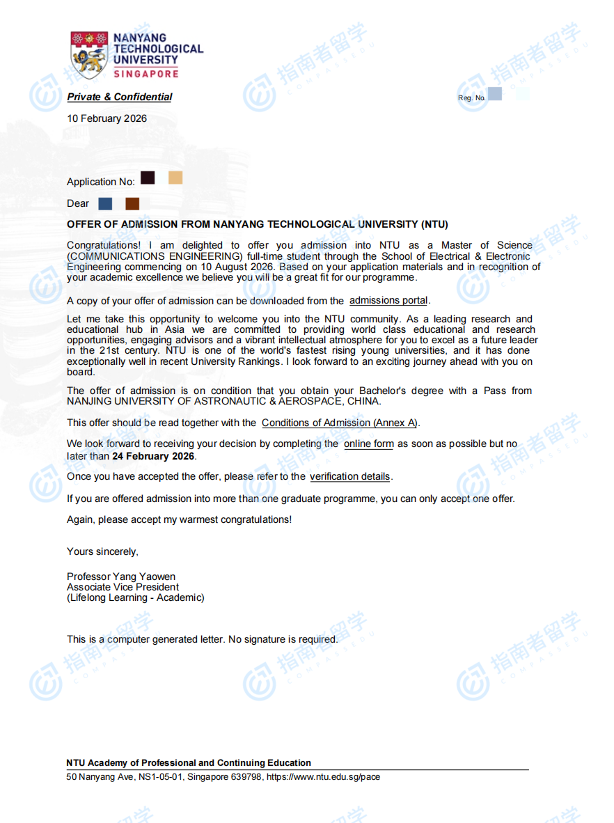 南洋理工大学通信工程理学硕士研究生offer一枚