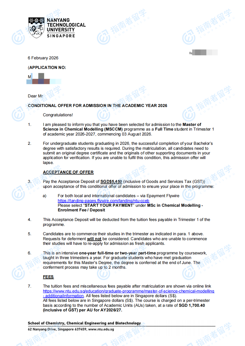 南洋理工大学化学建模理学硕士研究生offer一枚