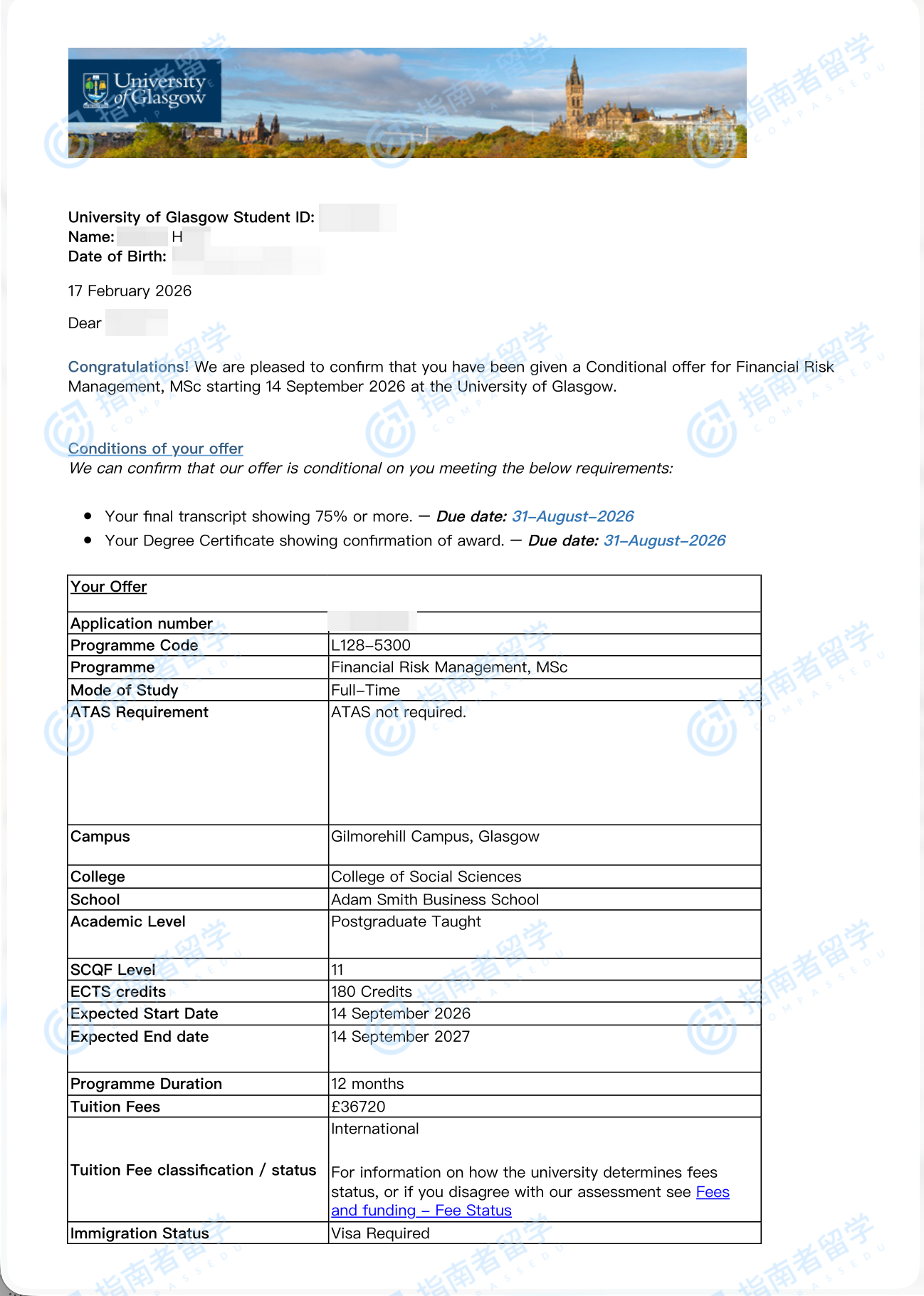 格拉斯哥大学金融风险管理理学硕士研究生offer一枚