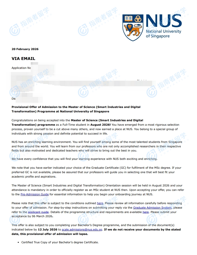 新加坡国立大学智能产业与数字化转型理学硕士研究生offer一枚