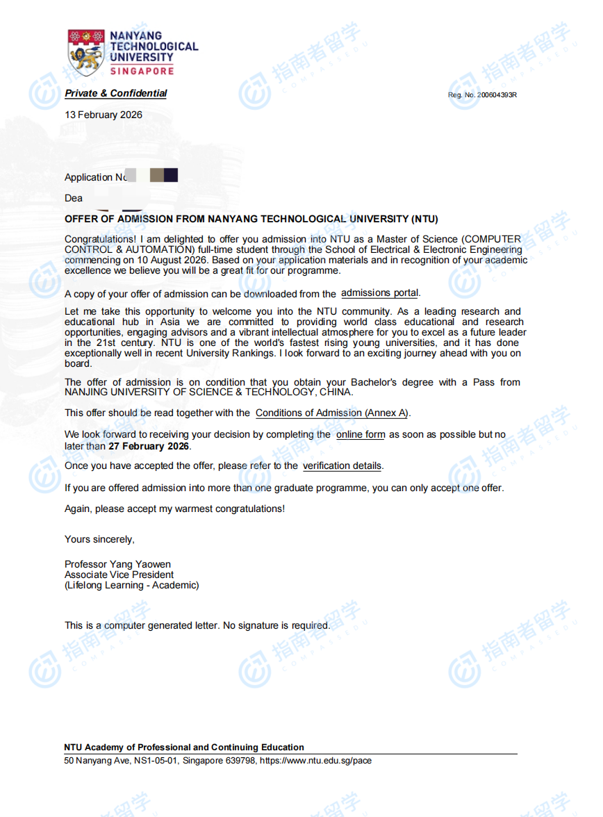南洋理工大学计算机控制与自动化理学硕士研究生offer一枚