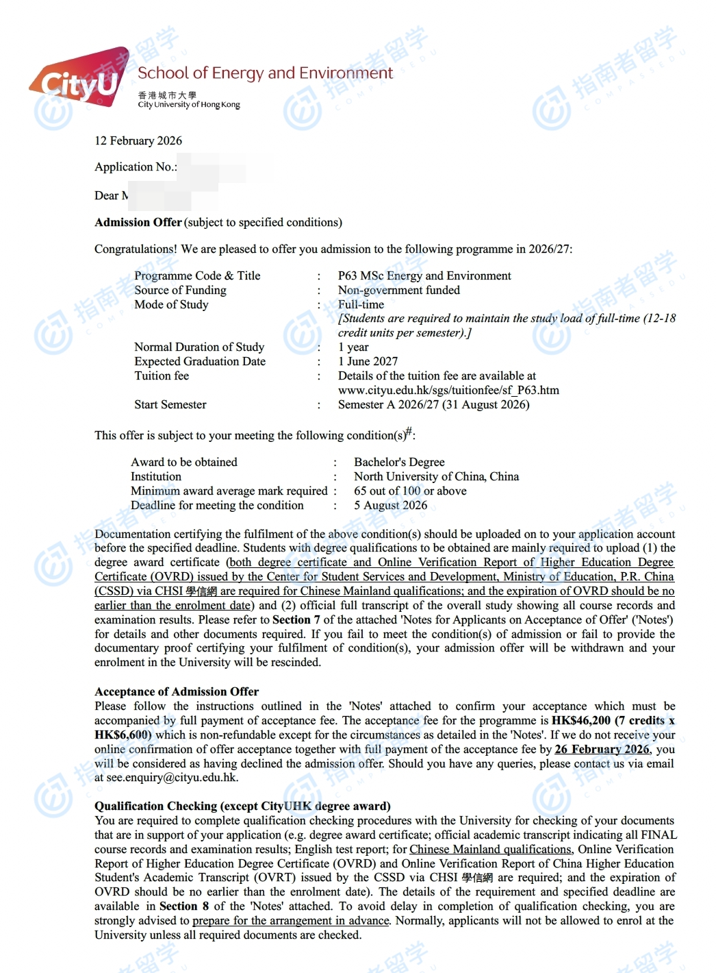 香港城市大学能源及环境理学硕士研究生offer一枚
