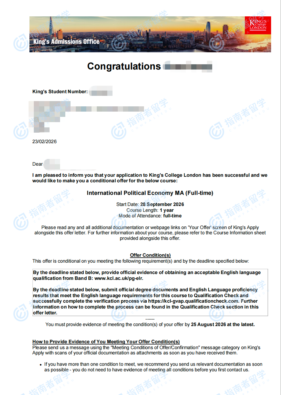 伦敦大学国王学院国际政治经济学文学硕士研究生offer一枚