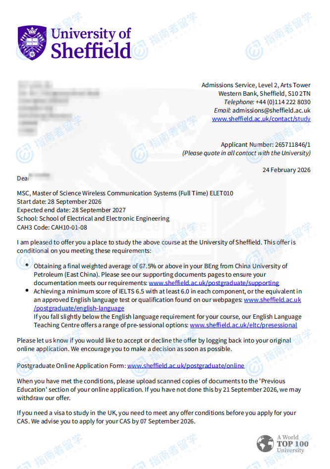 谢菲尔德大学电子与电气工程(工程)理学硕士研究生offer一枚