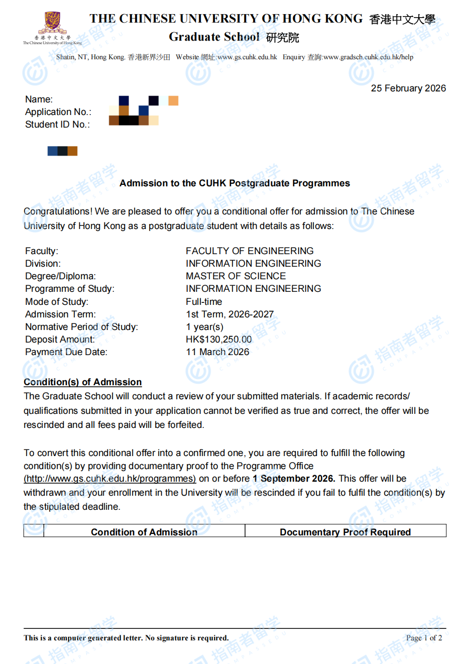 香港中文大学信息工程理学硕士研究生offer一枚