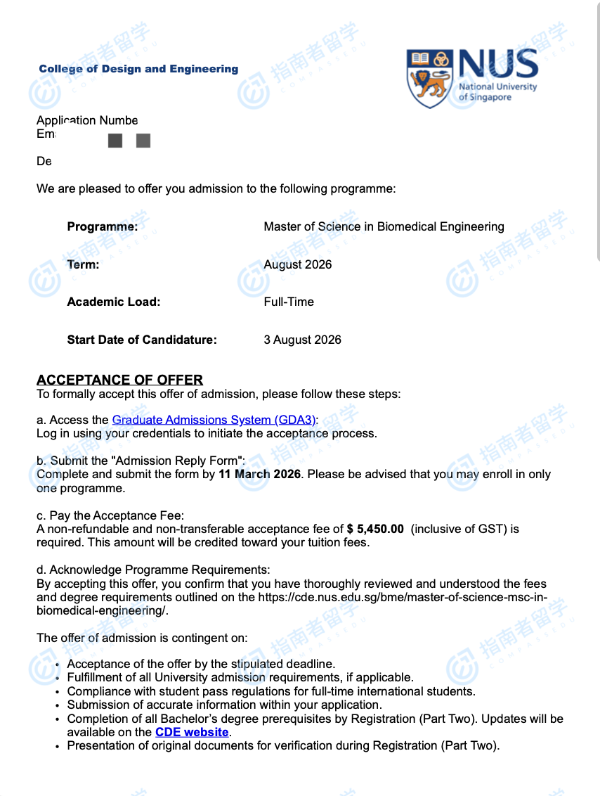 新加坡国立大学生物医学工程理学硕士研究生offer一枚