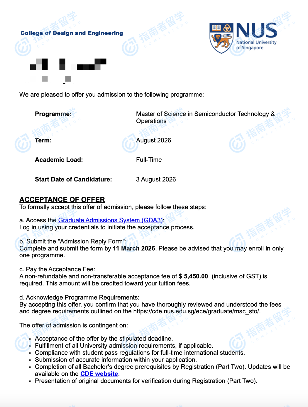 新加坡国立大学半导体技术与运作理学硕士研究生offer一枚