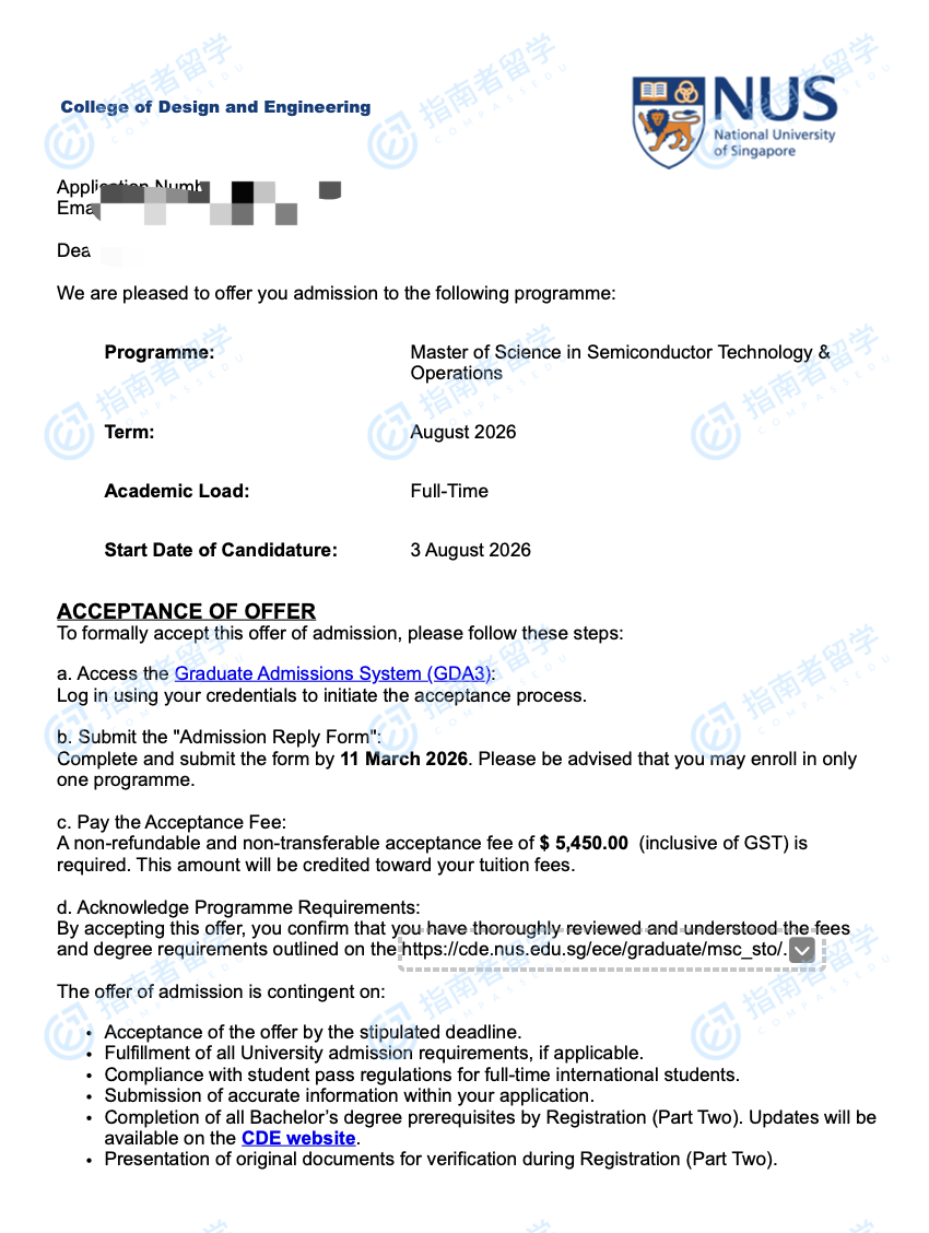 新加坡国立大学半导体技术与运作理学硕士研究生offer一枚