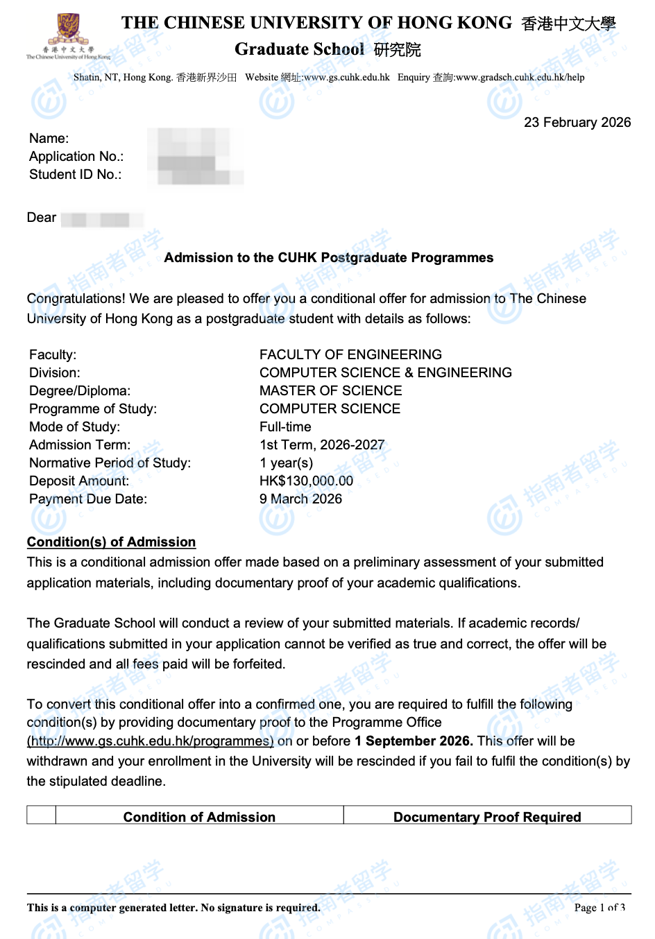 香港中文大学计算机科学理学硕士研究生offer一枚