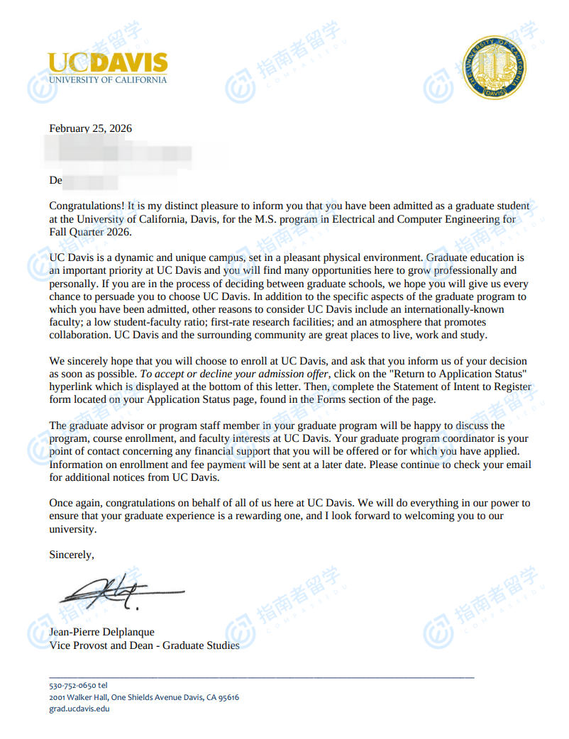 加州大学戴维斯分校电气与计算机工程理学硕士研究生offer一枚