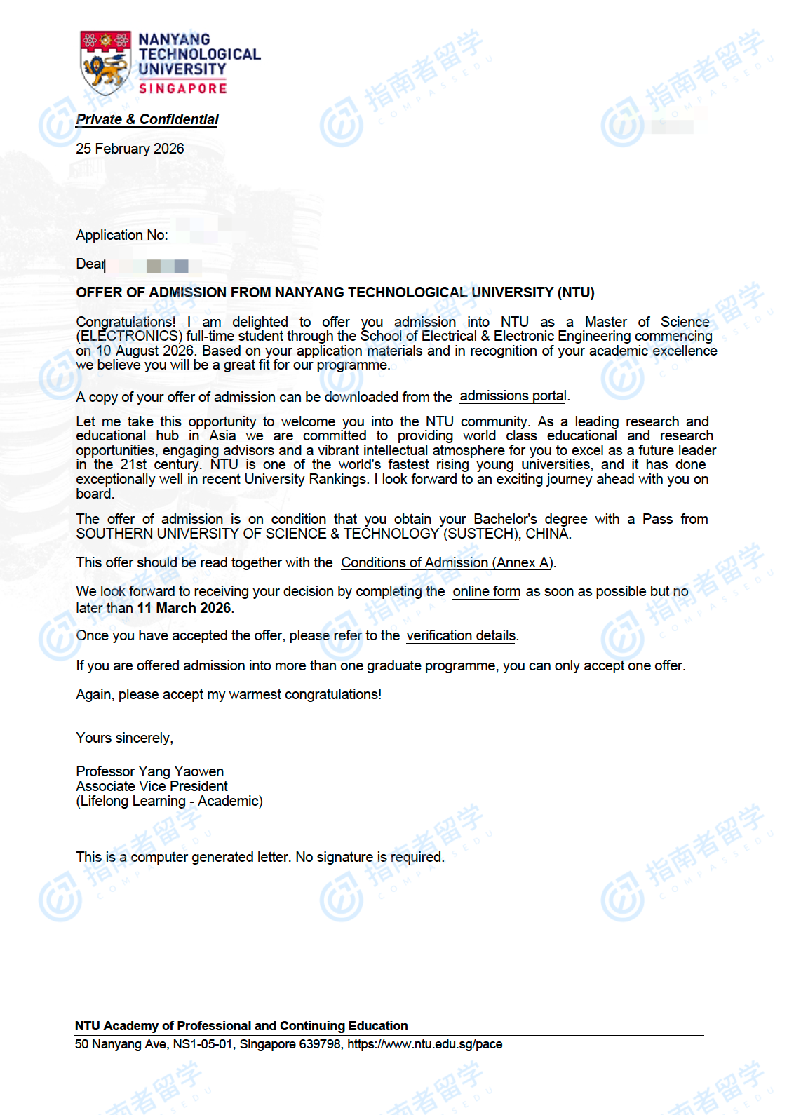南洋理工大学电子学理学硕士研究生offer一枚