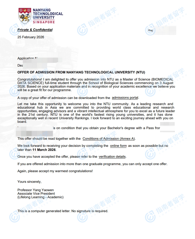 南洋理工大学生物医学数据科学理学硕士研究生offer一枚